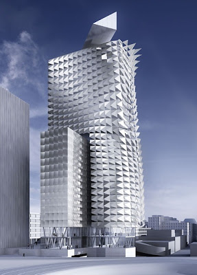 El programa es convencional-un edificio de oficinas-, pero la solución formal es todo un manifiesto del principio de la "estética de la sostenibilidad": por medio de una fachada activa, recubierta de chapa metálica plegada, y una turbina eólica integrada, la torre Town Town Erdberg, en Viena, será capaz de generar más energía de la que consume. La propuesta del estudio austríaco Coop Himmelb(l)au ha merecido el Premio a la Sostenibilidad 2010 de los MIPIM Architectural Review Future Project Awards.